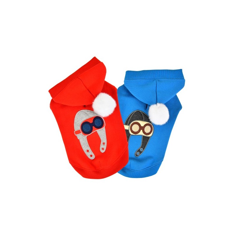 Maglioncino con cappuccio, decorata con applicazione di elmetto da pilota e pompon