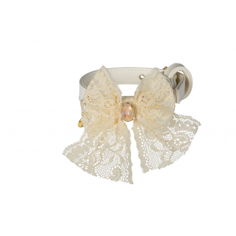 Raffinato collare in ecopelle, impreziosito da un fiocco in pizzo e da una pietra fantasia Swarovski.