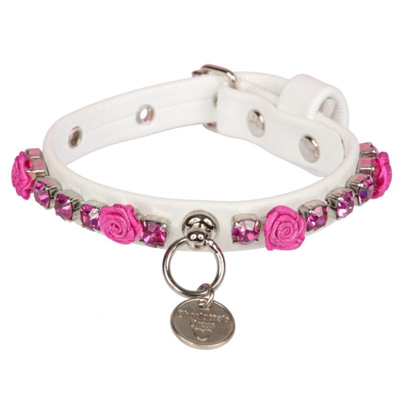 Raffinato collare in ecopelle, impreziosito da catena di strass alternati a rose di raso cucite a mano.