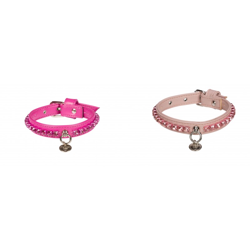 Raffinato collare, in morbida ecopelle, decorato con strass catena con finitura colorata. L'articolo è completamente cucito a mano.
