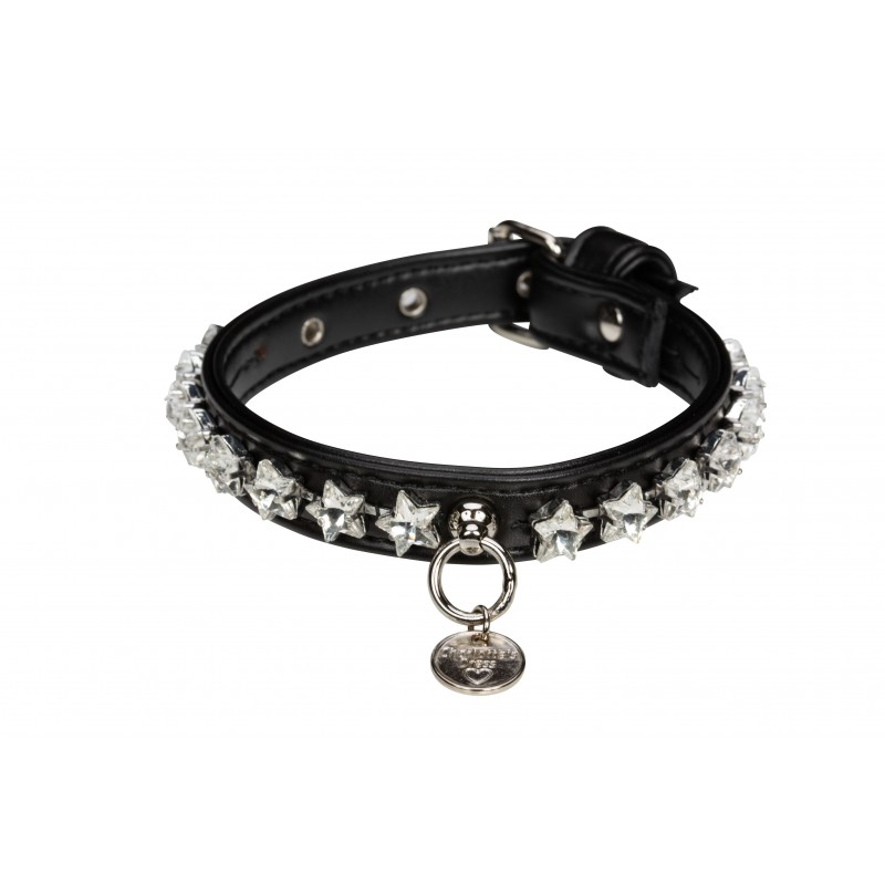 Meraviglioso collare in ecopelle decorato con una particolare catena realizzata con cristalli a forma di stella.