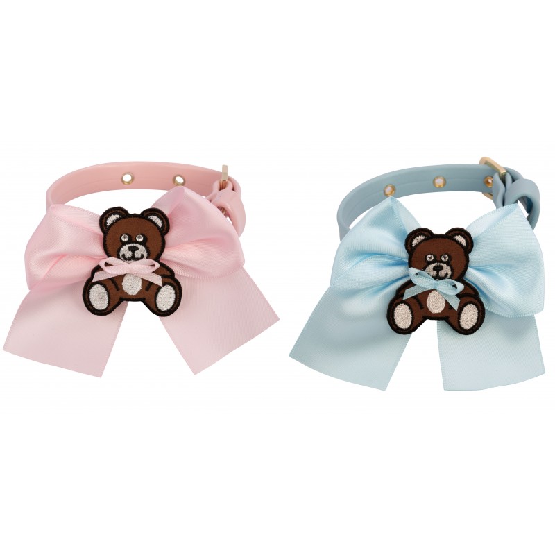 Raffinato collare in ecopelle, decorato con fiocco in raso e un tenero orsetto, dettagliato da cristalli Swarovski e fiocchetto. Colore: azzurro cielo o rosa baby. Galvanica: oro. Le parti metalliche sono nichel free. Altezza pettorina: 1,2 cm.