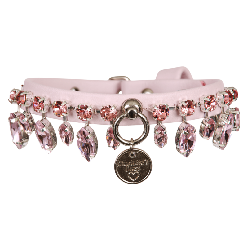 Raffinato collare, in morbida ecopelle, decorato con splendida catena di strass con pendenti. Il capo è cucito completamente a mano.