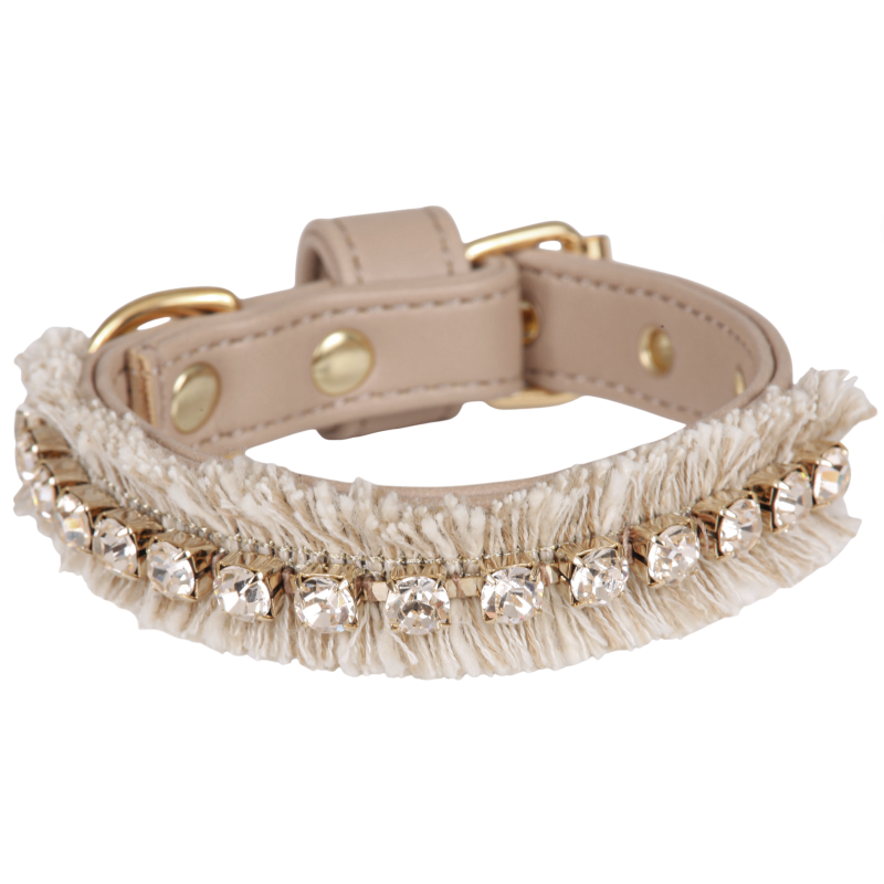 Raffinato collare, in morbida ecopelle, decorato con passamanerie a frange e catena di strass.