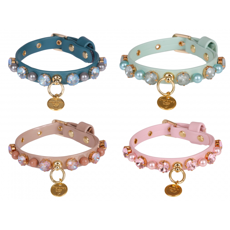 Collare lucido in ecopelle, impreziosito da una meravigliosa pietra fancy in cristalli Swarovski, alternata da perle colorate.