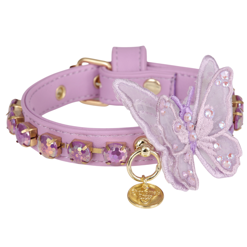 Collare scintillante in pelle vegana con catena di strass iridescenti e farfalla in dettaglio Swarovski. Tutto cucito a mano.