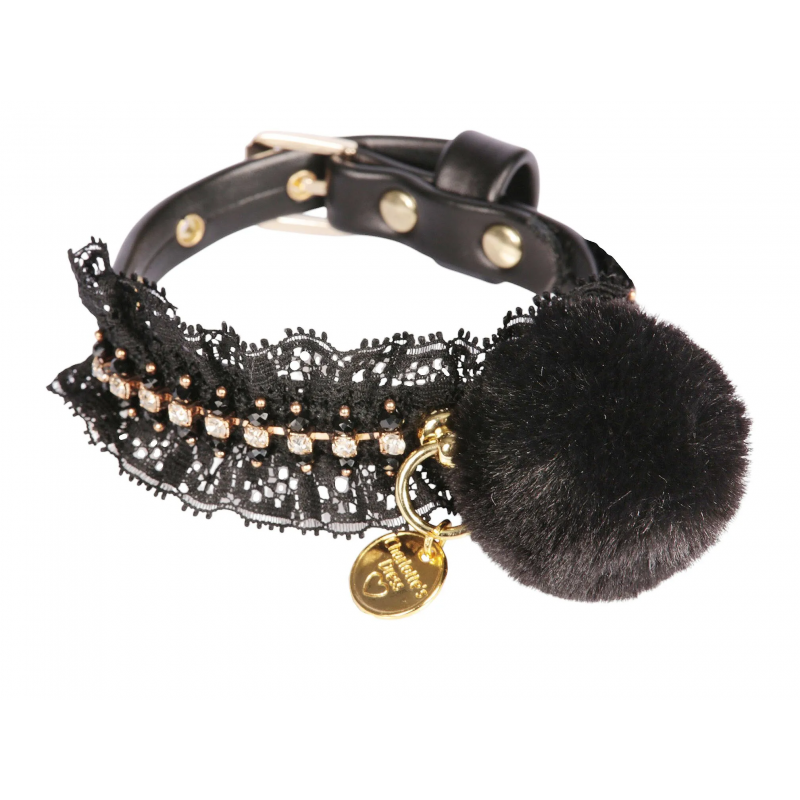 Collare scintillante, in morbida ecopelle, decorato con catena di strass, pizzo e pompon.