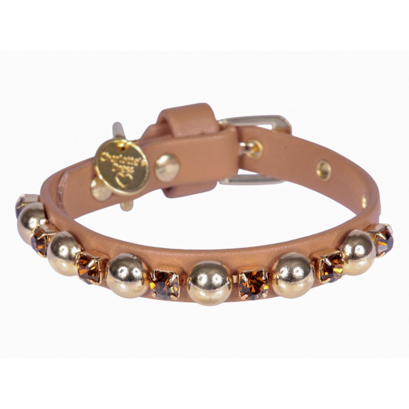 Raffinato collare in morbida ecopelle, decorato con catena di strass lavorata, cucita a mano.