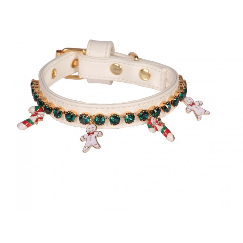 Delizioso collare dal sapore natalizio in morbida ecopelle, decorato con catena Swarovski e ciondoli natalizi.