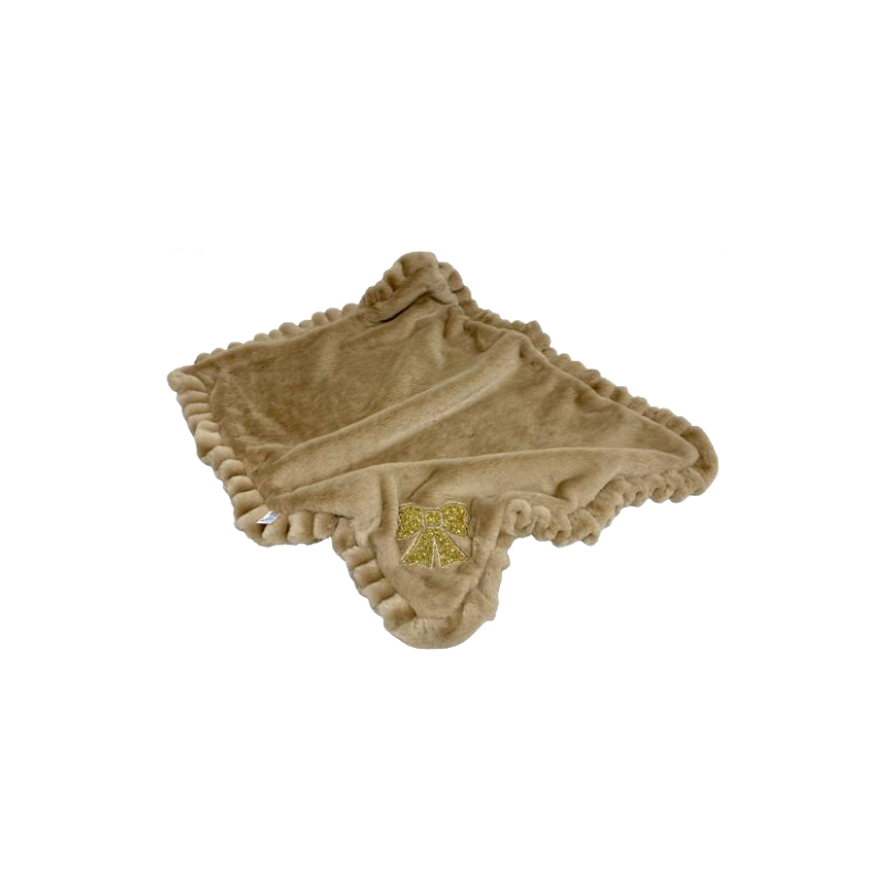 Soffice e calda copertina in soffice peluche con fiocco bordata da rouches