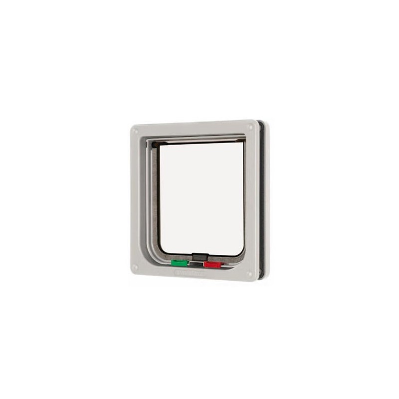 Chiusura a quattro vie: aperta, chiusa, solo entrata o solo uscita. Guarnizione anti-pioggia. Resistente a spifferi e intemperie. Adatta a porte e muri. Porta trasparente. Ingombro totale: 235x252 mm. Foro: 210x227 mm.