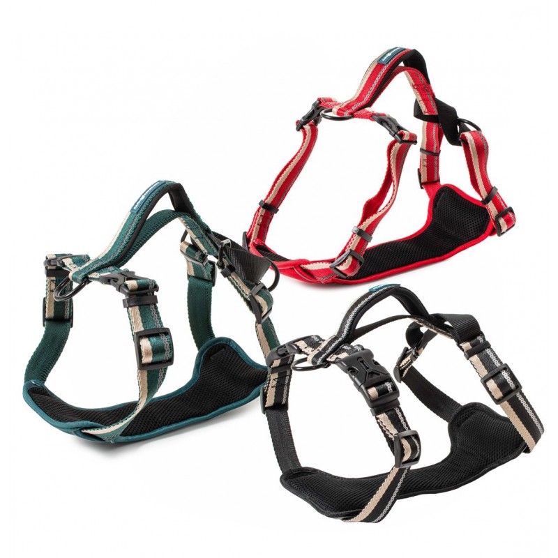 Pettorina con nuova fettuccia con inserti catarifrangenti e imbottitura in neoprene sul petto per maggiore comfort. Nuova maniglia di sicurezza sulla schiena con imbottitura in neoprene Tre diversi punti di aggancio: aggancio classico sulla schiena, aggancio sul petto easy walk per uso addestramento, Aggancio semi strangolo sul collo con funzione antifuga