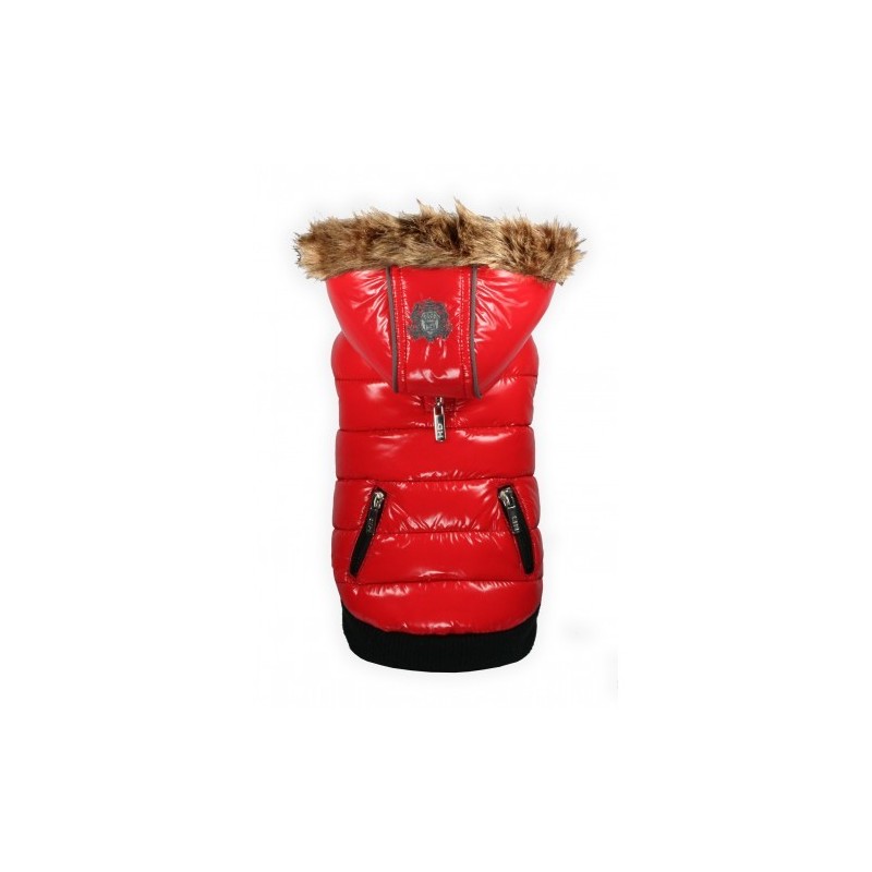 Giubbotto imbottito con cappuccio per cani sofisticati. Realizzato in materiale idrorepellente e ultra morbido con brillantezza lucida.