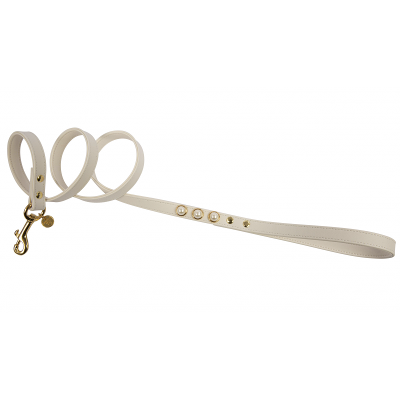 Raffinato guinzaglio in morbida ecopelle, decorato da una borchia con perla a forma di mezza palla con dettagli dorati.