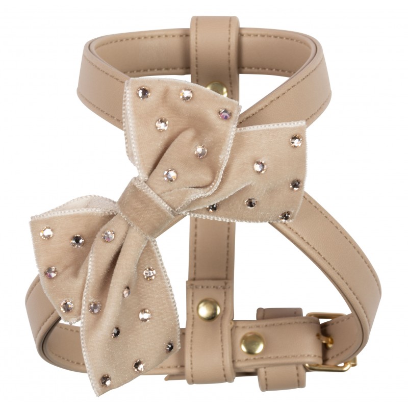 Pettorina in morbida ecopelle con fiocco in velluto tempestato di Swarovski. L'articolo è cucito completamente a mano.