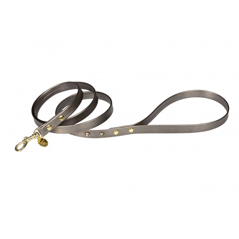 Guinzaglio in morbida ecopelle, decorato con rivetti Swarovski. Colore:grigio metallizzato o cammello. Finitura: oro.
