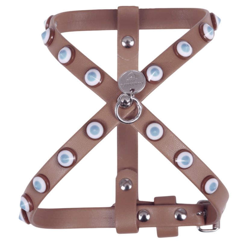 Pettorina in ecopelle, decorata con tricolore tramite rivetti a punta in abs. Colore: cammello.
