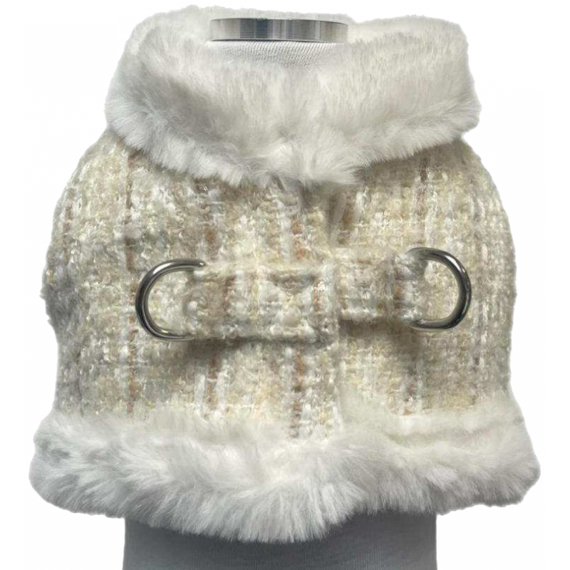 Un capo sofisticato e dal gusto ricercato, questa pettorina cropped in tweed con interno in ecopelliccia, incarna l’equilibrio perfetto tra classicismo e modernità. Realizzata in un tweed testurizzato dalle delicate sfumature di rosa cipria, beige e bianco, si distingue per la sua allure bon ton e la cura sartoriale dei dettagli. Il bordo in maglia spessa color crema incornicia il capo con un tocco di morbida struttura, mentre i due D-ring argentati sul davanti aggiungono un accento contemporaneo e audace, fondendo estetica e funzionalità. Ideale per completare un look sofisticato, questa pettorina si presta a essere indossata sopra camicie, abiti minimal o top in seta, regalando un twist couture a qualsiasi outfit.
