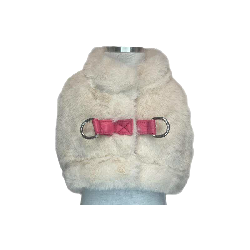 Pettorina a gilet in ecopellicia e trapunta impermeabile, con due anelli a D sul dorso per l'aggancio del guinzaglio in tutta sicurezza
