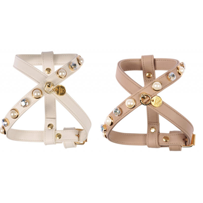 Raffinata pettorina in morbida ecopelle, decorata da una borchia con perla nella forma, alternata da una pietra Swarovski.