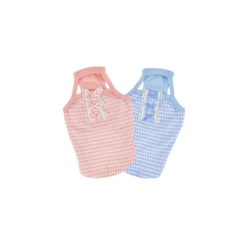 Canotta, motivo a quadretti, decorata con pizzo e nastri.