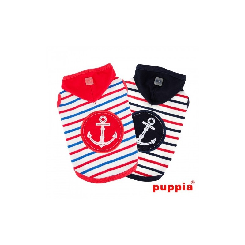 T-Shirt con cappuccio ed ancora applicata sul dorso, motivo a righe e tinta unita. Con foro per guinzaglio.