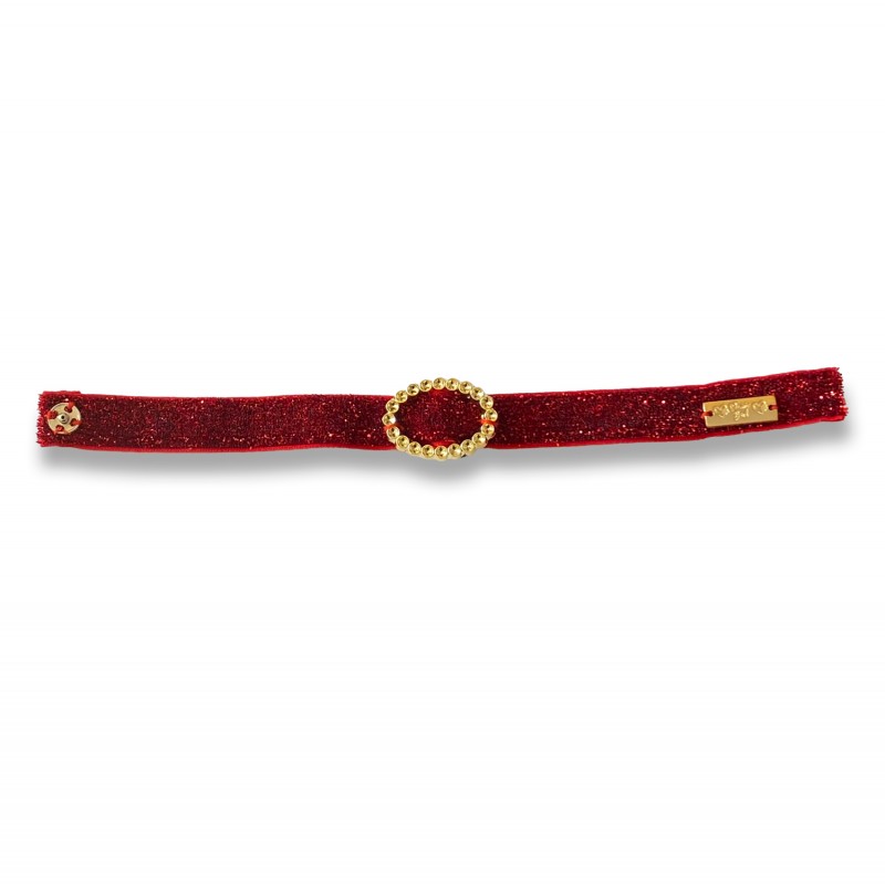 Fascetta realizzata con nastro elasticizzato glitter rosso, alta 1,2 cm, impreziosita da fibbia a corona di colore oro, chiusura con bottoncino automatico; completamente realizzato e cucito a mano.