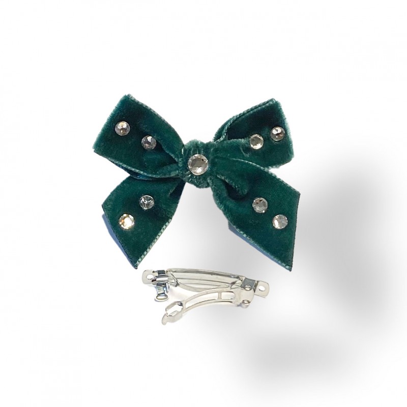Forcina fiocco in in velluto verde scuro e rosso, impreziosito da cristalli bianchi di alta qualità; completamente realizzato a mano. Made in Italy