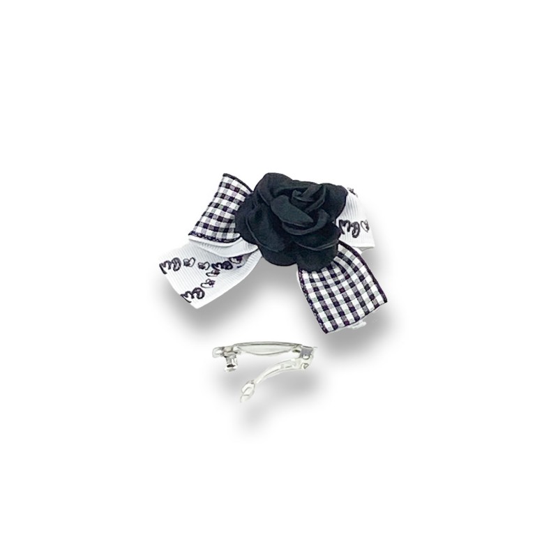 Forcina fiocco, realizzata con nastro gros-grain monogram “Minny Dog”, nastro vichy in bianco e nero, impreziosito da fiore nero. Tutte le parti metalliche sono trattate Nickel free. Completamente fatto a mano.