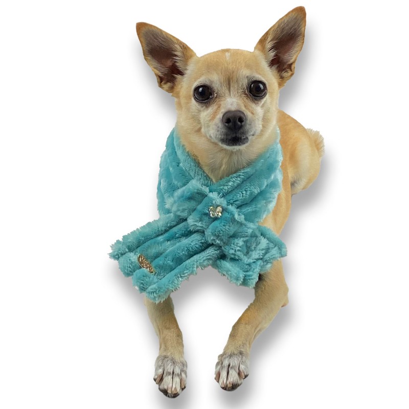 Sciarpa, realizzata in pile cannettato di colore verde acqua, doppio tessuto, arricchita da passante ferma sciarpa, impreziosita da farfalla in cristallo boreale di alta qualità di nota marca.