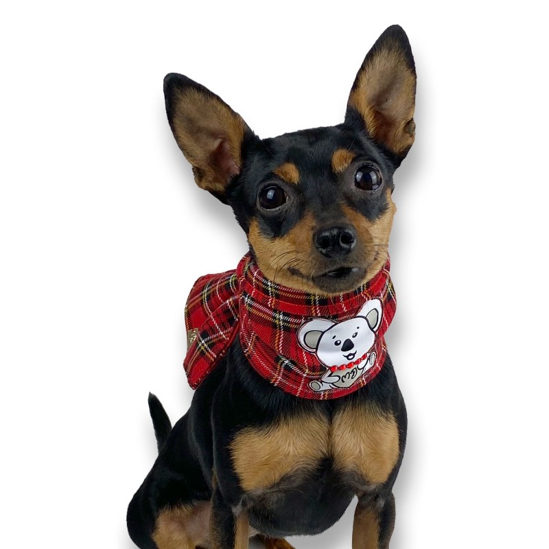 Sciarpina per animali, realizzata in tessuto in lana ed elastan fantasia tartan, doppio tessuto, chiusura a bottone con drappeggio impreziosita da 2 cristalli rossi di alta qualità di nota marca e arricchita da patch KIKI impreziosito da cristalli rossi di alta qualità di nota marca.
