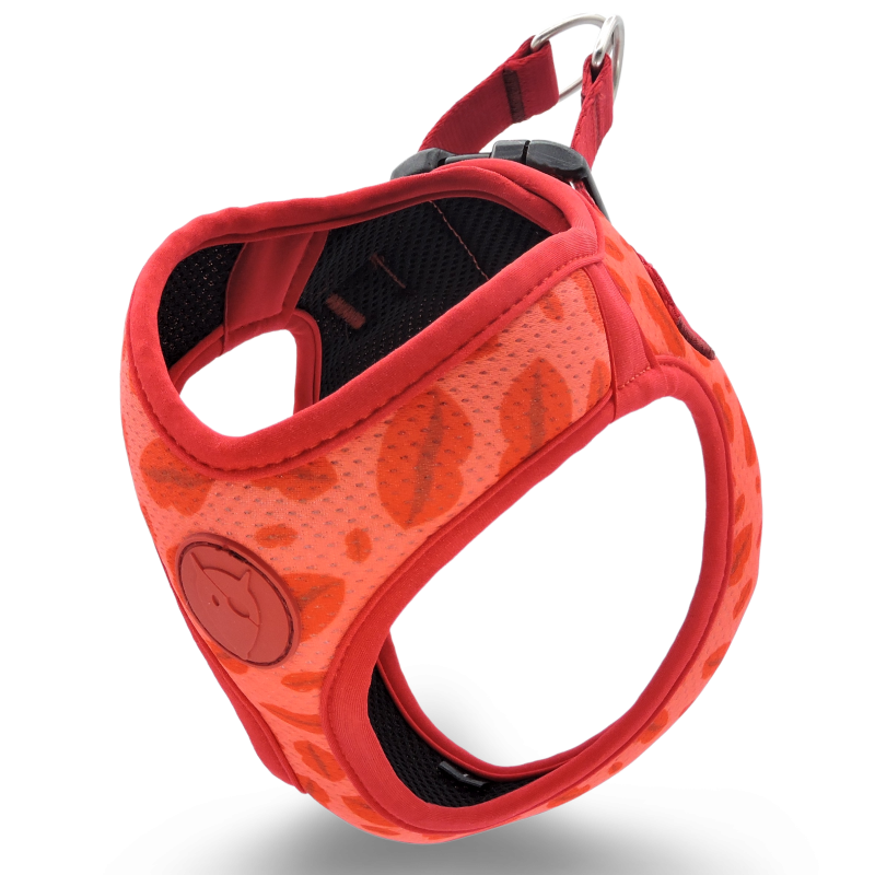La pettorina body mesh per cani MORSO® della linea LIPSTICK è realizzata con l’innovativo tessuto MESH traspirante e il raso di poliestere INTENSE™ post consumer derivato da bottiglie in PET, 100% riciclato e riciclabile.