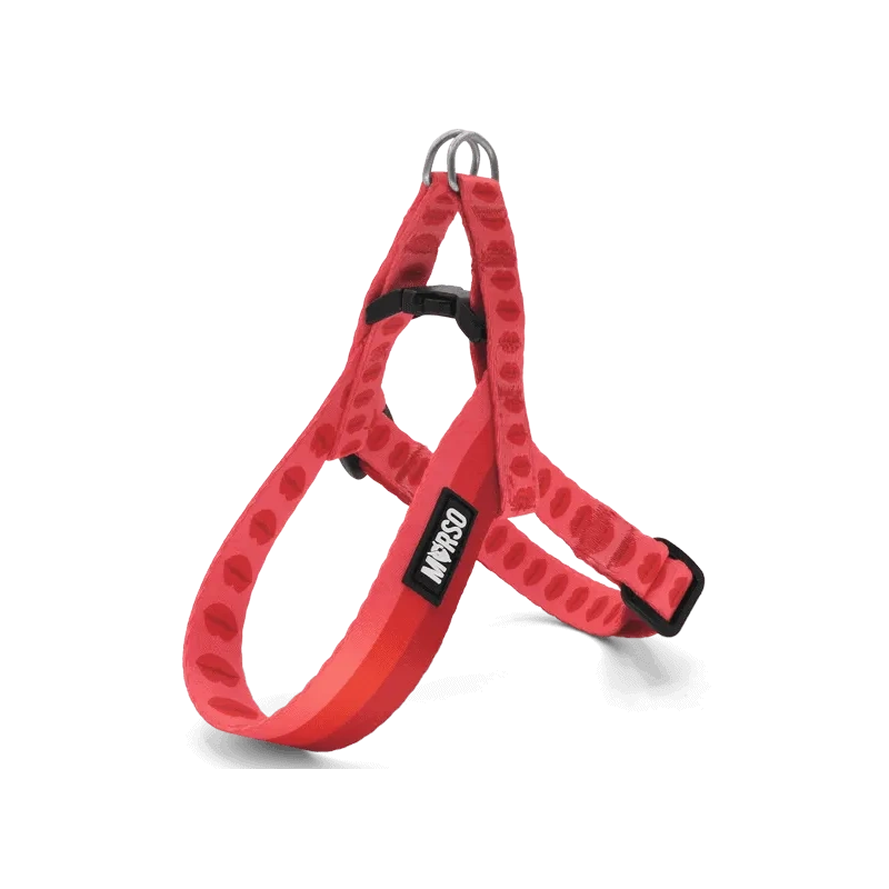 La pettorina mini MORSO® per cani di piccola taglia della linea LIPSTICK è interamente realizzata con l’innovativo raso di poliestere INTENSE™ post consumer: morbido, resistente, lavabile in lavatrice a 40° e