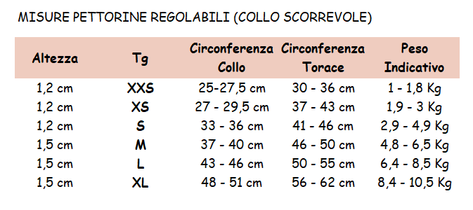 Le pettorine sono disponibili in diverse taglie, con larghezze studiate per adattarsi perfettamente alla corporatura del tuo cane: