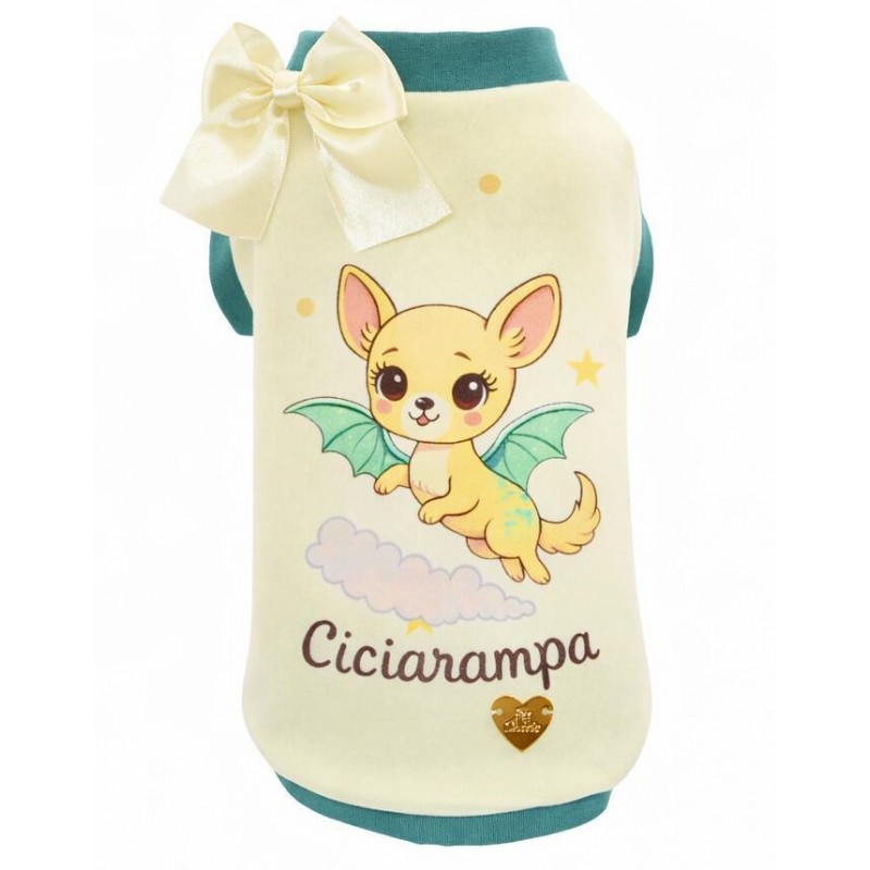 T shirt per cani estiva ispirata al mondo fantastico di Wonderland, con protagonista un dolce cagnolino alato reinterpretato nello stile Pet Chérie. La stampa raffigura il tenero personaggio “Ciciarampa”, immerso in un universo leggero e sognante, pensato per donare al capo un aspetto giocoso e raffinato allo stesso tempo. Realizzata in tessuto jersey mano pesca, è estremamente morbida al tatto, elastica e traspirante, ideale per garantire comfort e freschezza durante le giornate più calde. I bordi a contrasto valorizzano il design e donano un tocco distintivo, mentre il fiocchetto con spilla removibile aggiunge un dettaglio elegante e personalizzabile.