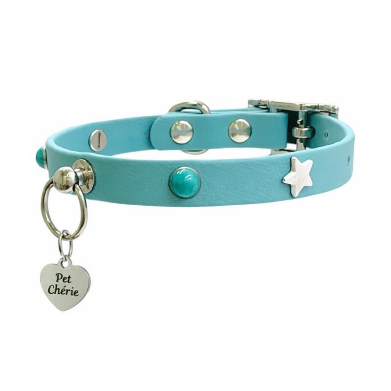 Il Collare Cabochon Turchese (collare turchese cabochon) è pensato per chi desidera un accessorio distintivo e moderno. Cabochon alternate a stelline rendono giocoso e versatile questo collarino.