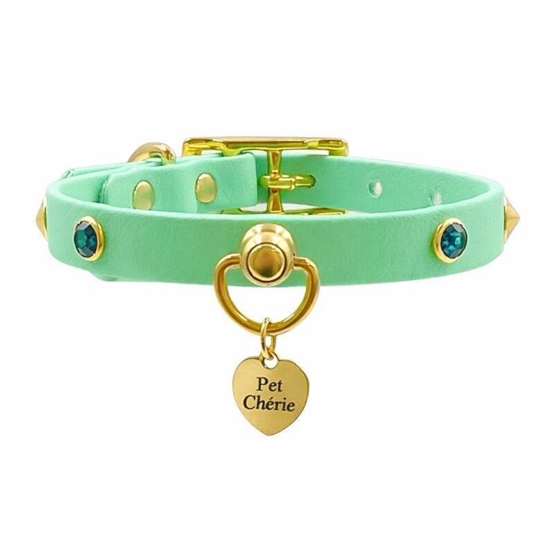 Il Collare Cone Green (collare verde borchie cono) Pet Chérie è pensato per chi desidera un accessorio distintivo e moderno. Le borchie a cono creano un effetto deciso, mentre gli strass verdi aggiungono luminosità e un tocco prezioso.