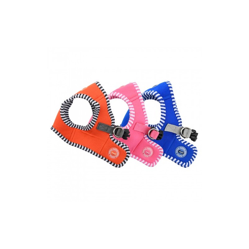 Pettorina modello B sicura e alla moda, tinta unita all’esterno e con motivo a righe all’interno, cintura toracica regolabile e targhetta SMART.