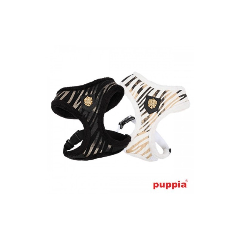 Pettorina con motivo a zebra e tinta unita, stemma Puppia sul davanti e fascia toracica regolabile.