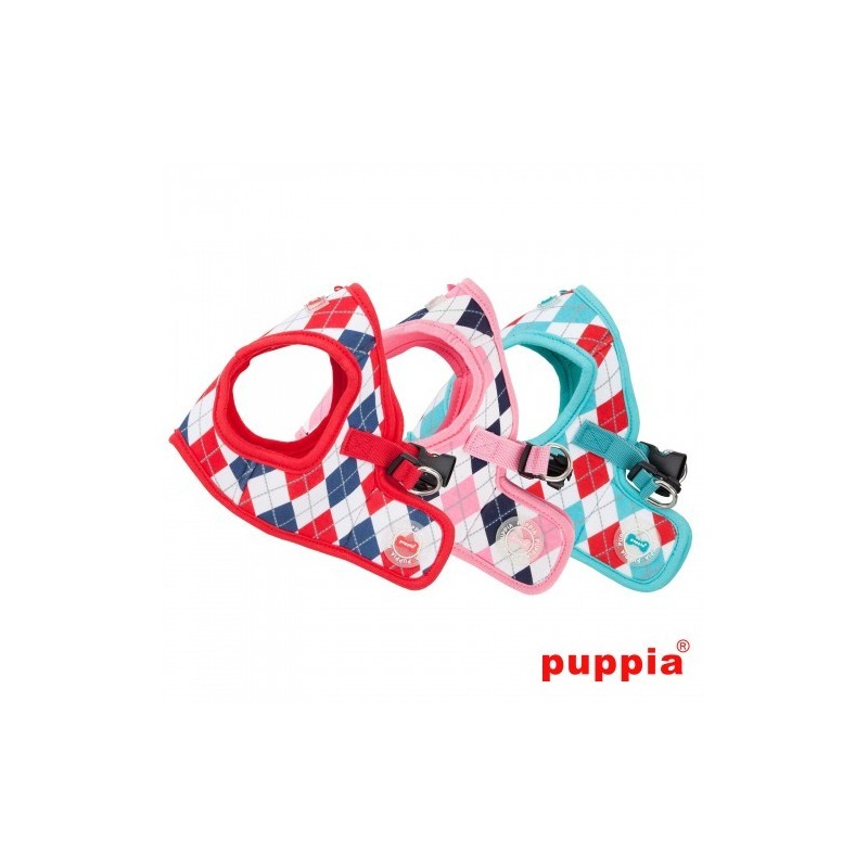 Sicura ed elegante pettorina Puppia con motivo Argyle, modello B, e etichetta in gomma Puppia.