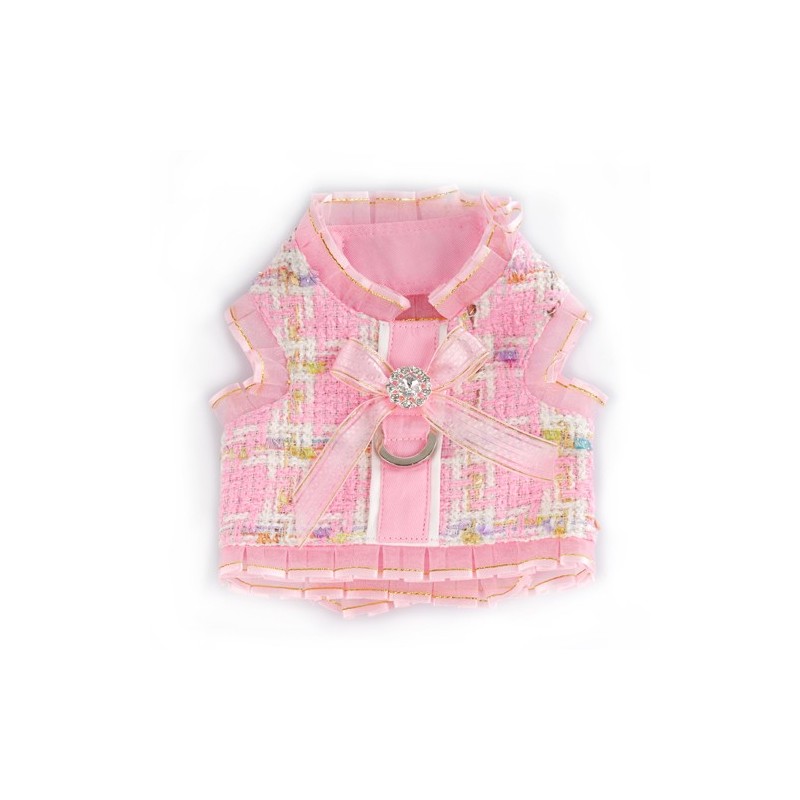 Pettorina a top rosa con esterno tweed e fodera a righe rosa ha dettagli con arco, strass, e passamanerie in pizzo con chiusura in velcro.