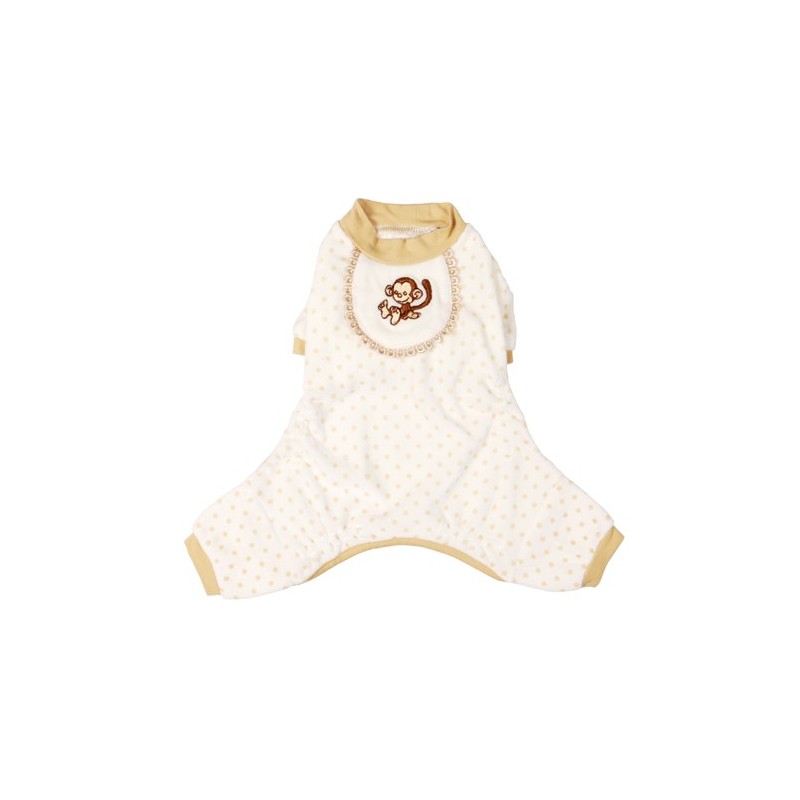 Tenerissima tutina pigiamino a pois beige, con scimmietta ricamata sul dorso.