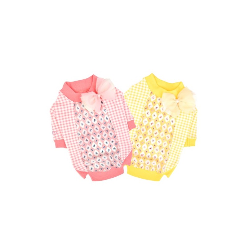 T-shirt girocollo, motivo a scacchi e fantasia con farfalle, decorata con nastro