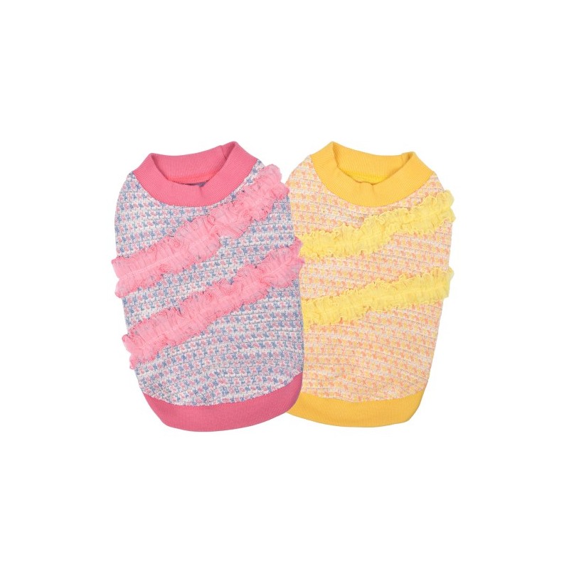 Maglia smanicata, motivo pied de poule e tinta unita, decorata con due laccetti sul dorso
