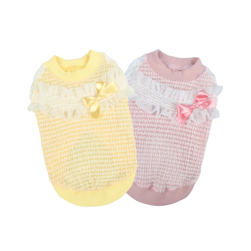 T-shirt base a girocollo, motivo jacquard e tinta unita, decorate con nastro con volant sul collo