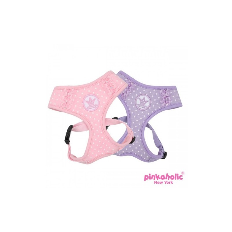 Bellissima e sicura pettorina Pinkaholic con pois e tinta unita. Decorata con volant e emblema Pinkaholic.