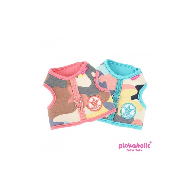 Bellissima e sicura pettorina Pinkaholic con motivo mimetico e tinta unita ed emblema Pinkaholic.
