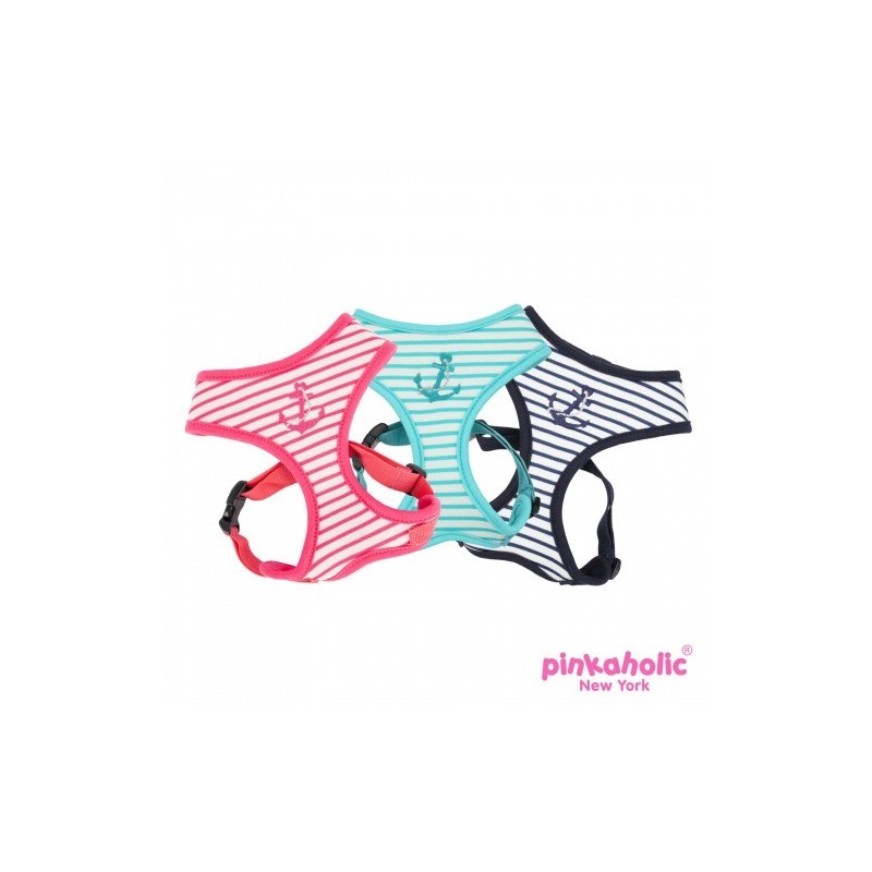 Bellissima e sicura pettorina Pinkaholic con motivo a righe e tinta unita, ricamo di ancora sul davanti e fascia toracica regolabile.