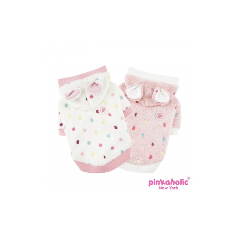 Maglioncino invernale caldo e morbido con cappuccio e orecchie da coniglio, decorato da motivo a pois colorati e tinta unita.