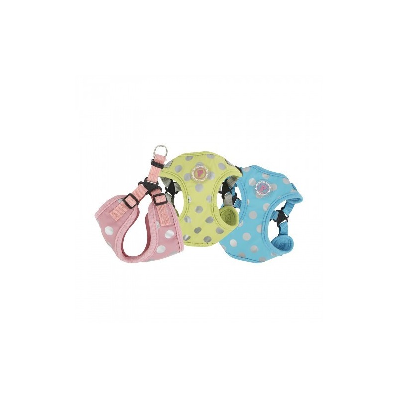 Pettorina modello C con motivo a pois, collo e torace regolabili con fibbia.